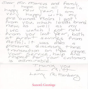 Dear Mr. Marcus and family, I hope you all have a happy new year! I am very happy with my pre-owned Rolex I got from you, which looks brand new, as well as my IWC watch I got new at great savings from Retail. It was also a pleasure discussing these transactions on the phone. Your service, help, and respect for your customers is admirable. Thank you, Larry Rittenberg