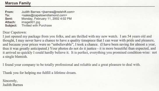 ![]() | Dear Capetown: I just opened my package from you folks, and am thrilled with my new watch. I am 54 years old and thought, I may never have a chance to have a quality timepiece that I can wear with pride and pleasure, and because your prices were son "unbelievable", I took a chance. (I have been saving for almost a year, thus it was greatly anticipated.) Your photos do not do it justice - it is more beautiful than expected, and it arrived so quickly I could hardly believe it. It is perfect, everything you promised condition-wise: not a single blemish. I found your company to be totally professional and reliable and a great pleasure to deal with. Thank you for helping me fulfill a lifetime dream.