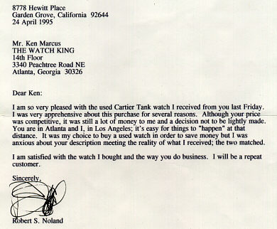 ![]() | I am so very pleased with the used Cartier Tank watch I received from you last Friday. I was very apprehensive about this purchase for several reasons. Although your price was competitive, it was still a lot of money to me and a decision not to be lightly made. You are in Atlanta and I, in Los Angeles; it's easy for things to "happen" at that distance. It was my choice to buy a used watch in order to save money but I was anxious about your description meeting the reality of what I received; the two matched. I am satisfied with the watch I bought and the way you do business. I will be a repeat customer. Sincerely, Robert S. Noland |