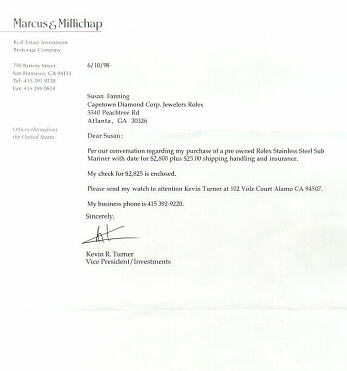 Per our conversation regarding my purchase of a pre-owned Rolex Stainless Steel Submariner with date for $2,800 plus $25.00 shipping handling and insurance.