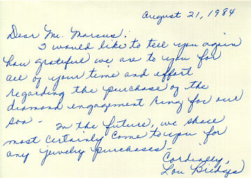 ![]() | August 21, 1984 Dear Mr. Marcus I would like to tell you again how grateful we are to you for all of your time and effort regarding the purchase of the diamond engagement ring for our son. In the future, we shall certainly come to you for any jewelry purchases. Cordially, Lou Bridges |