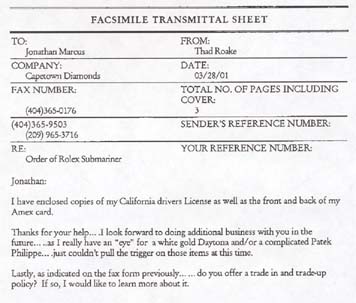 Jonathan: I have enclosed copies of my California drivers License as well as the front and back of my Amex card. Thanks for your help... I look forward to doing additional business with you in the future... as I really have an "eye" for a white gold Daytona and/or a complicated Patek Philippe... just couldn't pull the trigger on those items at this time. Lastly, as indicated on the fax form previously... do you offer a trade in and trade-up policy? If so, I would like to learn more about it.