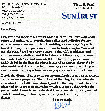 Dear Ken, I just wanted to write a note in order to thank you for your assistance and guidance in purchasing, a diamond solitaire for my wife to commemorate our tenth wedding anniversary. My wife loved the ring that I presented her on Saturday night. You sent me the ring based upon my review of the GIA certificate and your recommendation, and it had the most fire of any diamond I had looked at. You and your staff have been very professional and helpful in finding the right diamond at a price that nobody else could beat. I was also impressed by your trust in sending me for inspection with no payment or credit information. I took the diamond ring to a master gemologist to get an appraisal for insurance purposes. She indicated the ring has a wholesale cost which was $500 more than I paid for the ring. In addition, the ring had an average retail value which was more than twice the price I paid. There is no doubt that I got a good deal from you and look forward to purchasing more fine jewelry from you in the future.
