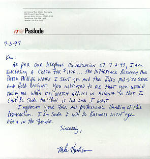 Ken: As per our telephone conversation of 7-2-97, I am enclosing a check for $1100...the difference between the Patek Phillipe watch I sent you and the Rolex mid-sized steel and gold Datejust. You indicated to me that you would notify me when my watch arrives in Atlanta so that I can be sure the dial is the one I want. I appreciate you fair and professional handling of this transaction. I am sure that I will do business again with you in the future. Sincerely, |