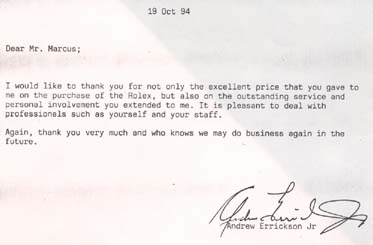 Dear Mr. Marcus; I would like to thank you for not only the excellent price that you gave to me on the purchase of the Rolex, but also on the outstanding service and personal involvement you extended to me. It is pleasant to deal with professionals such as yourself and our staff. Again, thank you very much and who knows we may do business again in the future.