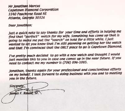 Dear Jonathan: Just a quick note to say thanks for your time and efforts in helping me find that "perfect" watch for my wife. Something has come up that is going to make me put the "search" on hold for a little while. I just wanted to let you know that I'm still planning on getting her the watch and that I'm convinced that the OnLY place to go is Capetown Diamond. I've pretty much decided to go with a new watch and thought I would just mention this to you in case one comes up in the near future. If you need to contact me my number is (706) 896-1085. Jonathan, thanks again for your professional and conscientious efforts on my behalf. I look forward to doing business with you in the future.