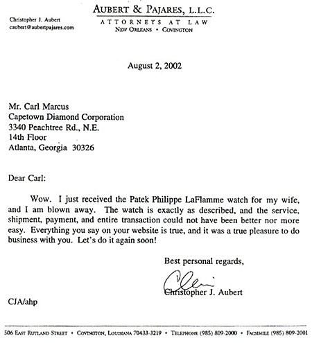 August 2, 2002 Dear Carl, Wow. I just received the Patek Philippe LaFlamme watch for my wife, and I am blown away. The watch is exactly as described, and the service, shipment, payment, and entire transaction could not have been better nor more easy. Everything you say on your website is true, and it was a true pleasure to do business with you. Let's do it again soon! Sincerely, Christopher J. Aubert Atlanta, GA |