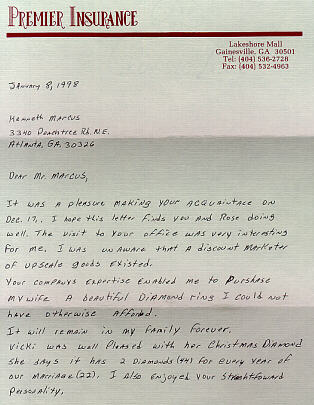 Dear Mr. Marcus, It was a pleasure making your acquaintance on Dec. 17. I hope this letter finds you and Rose doing well. The visit to your office was very interesting for me. I was unaware that a discount marketer of upscale goods existed. Your company's expertise enabled me to purchase my wife a beautiful diamond ring I could not have otherwise afforded. It will remain in my family forever. Vicki was well pleased with her Christmas Diamond. She says it has 2 diamonds (44) for every year of our marriage (22). I also enjoyed your straight-forward personality. Your Friend,