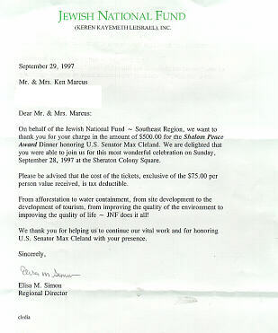 Dear Ken, On behalf of the Jewish National Fund ~ Southeast Region, we want to thank you for your charge in the amount of $500 for the Shalom Peace Award Dinner honoring US Senator Max Cleland. We are delighted that you were able to join us for this most wonderful celebration on Sunday, September 28, 1997 at the Sheraton Colony Square. We thank you for helping us to continue our vital work and for honoring U.S. Senator Max Cleland with you presence. Sincerely,