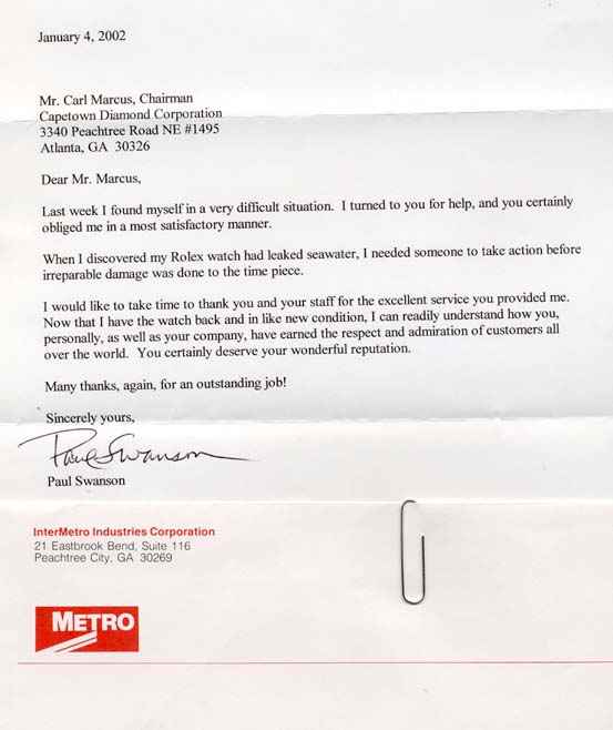 ![]() | Dear Mr. Marcus, Last week I found myself in a very difficult situation. I turned to you for help, and you certainly obliged me in a most satisfactory manner. When I discovered my Rolex watch had leaked seawater, I needed someone to take action before irreparable damage was done to the time piece. I would like to take time to thank you and your staff for the excellent service you provided me. Now that I have the watch back in like new condition, I can readily understand how you, personally, as well as your company, have earned the respect and admiration of customers all over the world. You certainly deserve your wonderful reputation. Many thanks, again, for an outstanding job! Sincerely yours,