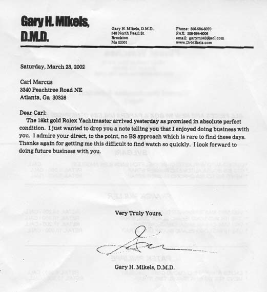 Dear Carl: The 18kt gold Rolex Yachtmaster arrived yesterday as promised in absolute perfect condition. I just wanted to drop you a note telling you that I enjoyed doing business with you. I admire your direct, to the point, no BS approach which is rare to find these days. Thanks again for getting me this difficult to find watch so quickly. I look forward to doing future business with you. Very Truly Yours,