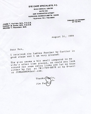 ![]() | August 31, 1999 Dear Ken: I received the Ladies Panther by Cartier in good shape and I am very pleased. The size seems a bit small compared to my wife's other time pieces, so could you look around for some extra links and let me know by fax or email. Thanks Again, Jim Patten, M.D. |
