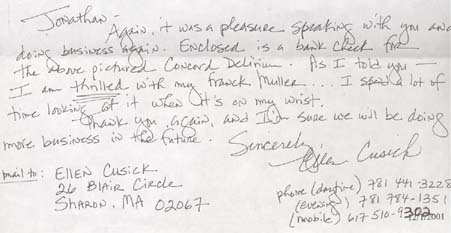 Jonathan - Again, it was a pleasure speaking with you and doing business again. Enclosed is a bank check for the Concord Delirium. As I told you - I am thrilled with my Franck Muller... I spend a lot of time looking at it when it's on my wrist. Thank you again, and I'm sure we will be doing more business in the future.