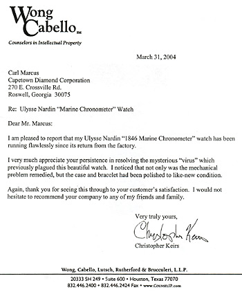 Dear Mr. Marcus: I am pleased to report that my Ulysse Nardin "1846 Marine Chronometer" watch has been running flawlessly since its return from the factory. I very much appreciate your persistence in resolving the mysterious "virus" which previously plagued this beautiful watch. I noticed that not only was the mechanical problem remedied, but the case and bracelet had been polished to like-new condition. Again, thank you for seeing this through to your customer's satisfaction. I would not hesitate to recommend your company to any of my friends and family. Very truly yours, March 31, 2004 |