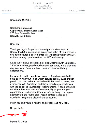----- Original Message ----- From: Dennis White <dennisrwhite@comcast.net> To: Jonathan Marcus <jon@capetowndiamond.com> Sent: Friday, October 07, 2005 11:31 AM Subject: RE: Tracking Number Jonathan... Just received the watches. Thank you for the deployant clasp. She will love this watch. The gent's will work well. Thanks, Dennis