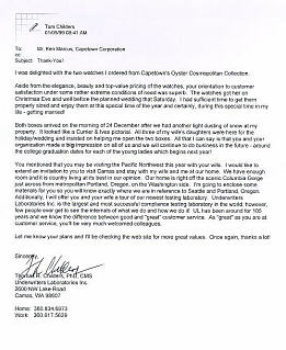 Dear Mr. Marcus I was delighted with the two watches I ordered from Capetown's Oyster Cosmopolitan Collection. Aside from the elegance, beauty, and top-value pricing of the watches, your orientation to customer satisfaction under some rather extreme conditions of need was superb. The watches got here on Christmas Eve and well before the planned wedding that Saturday. All that I can say is that you and your organization made a big impression on all of us and we will continue to do business in the future! Sincerely, Thomas R. Childers, PhD, CMS